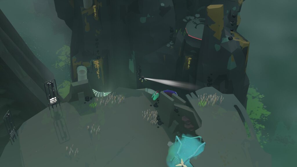 北東へ道なりに進んだあと、オーブを入れると動く足場があるのでそこに緑のオーブを入れて移動します。移動後、緑オーブを持ち上げて持って進み、上下するギミックを繰り返して最後まで移動したあとそこから降りると月の先祖が見つけられます。途中でも降りられるところがありますが、そちらは進行方向なので間違わないように注意してください。