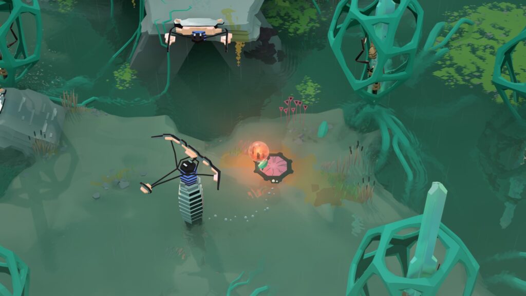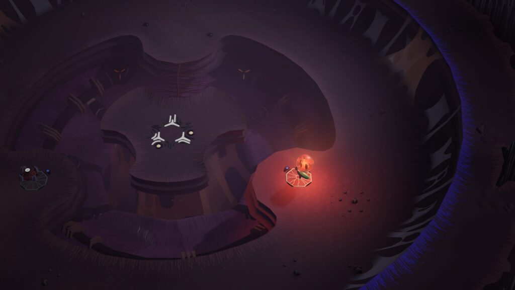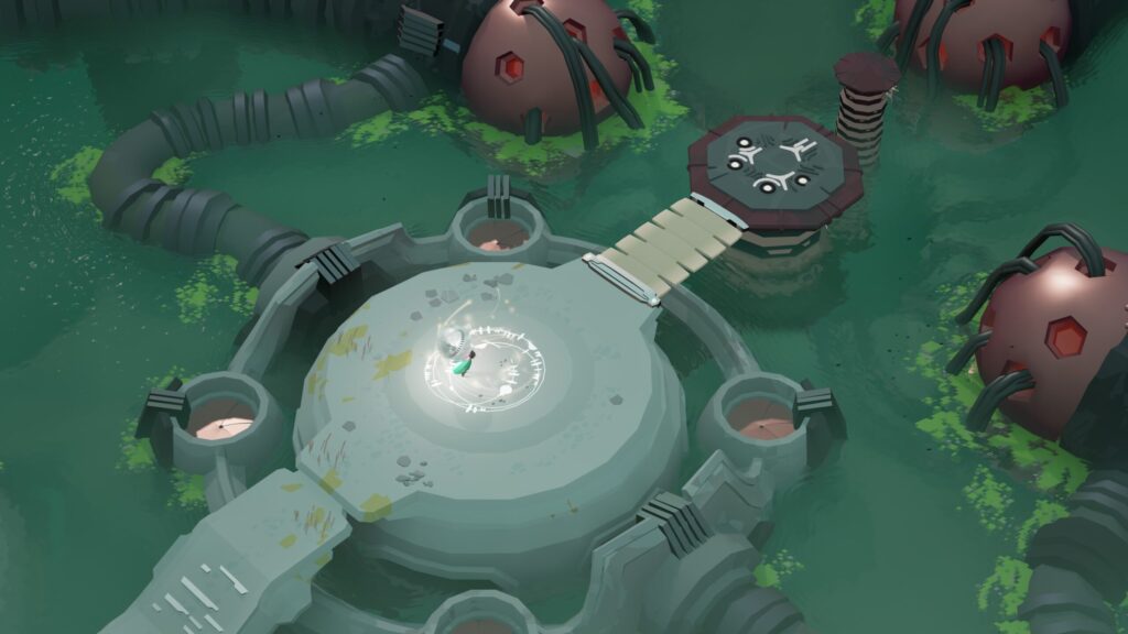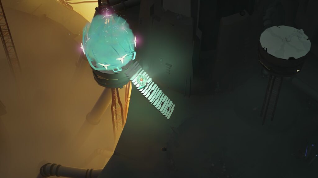 東側へ進みロボットを起動したあと、ロボットに1つ橋を渡らせて合流し、一緒に階段を降りて南下します。画像のギミックに到着後、スイッチにロボットをのせた状態でオーブを取り上げて停止させます。もう片側に自分が乗るとロックが解除され、月の先祖を解放することができるようになります。